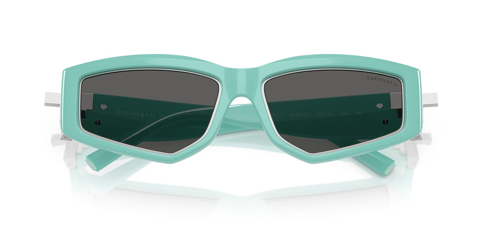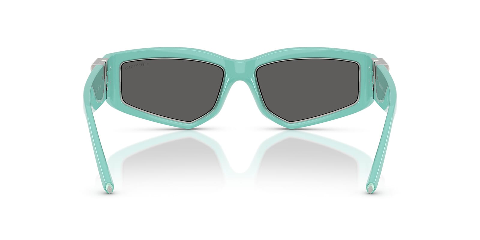 This rectangular Tiffany sunglass comes in a tiffany blue frame with dark grey lenses.