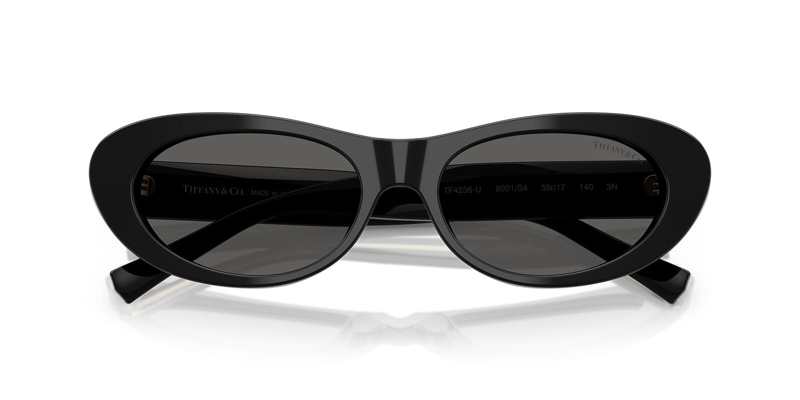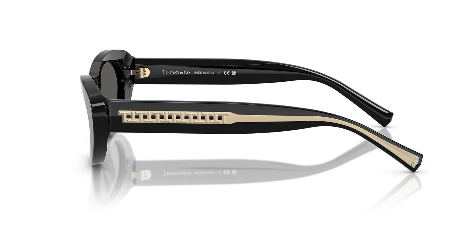 This round Tiffany sunglass comes in a black frame with dark grey lenses.