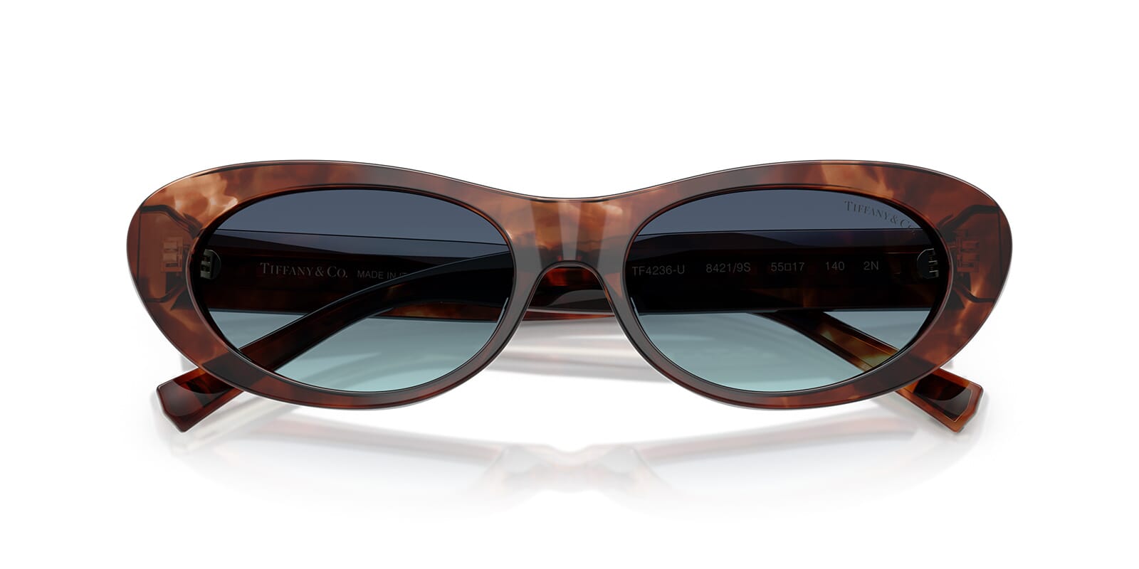 This round Tiffany sunglass comes in a spotted brown havana frame with blue azure gradient lenses.