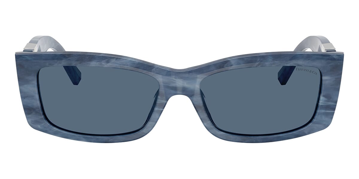 This rectangular Tiffany sunglass comes in a striped tanzanite frame with dark blue lenses.
