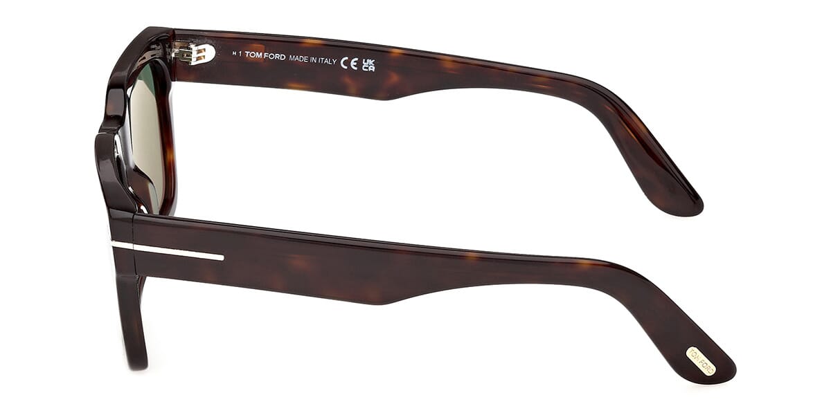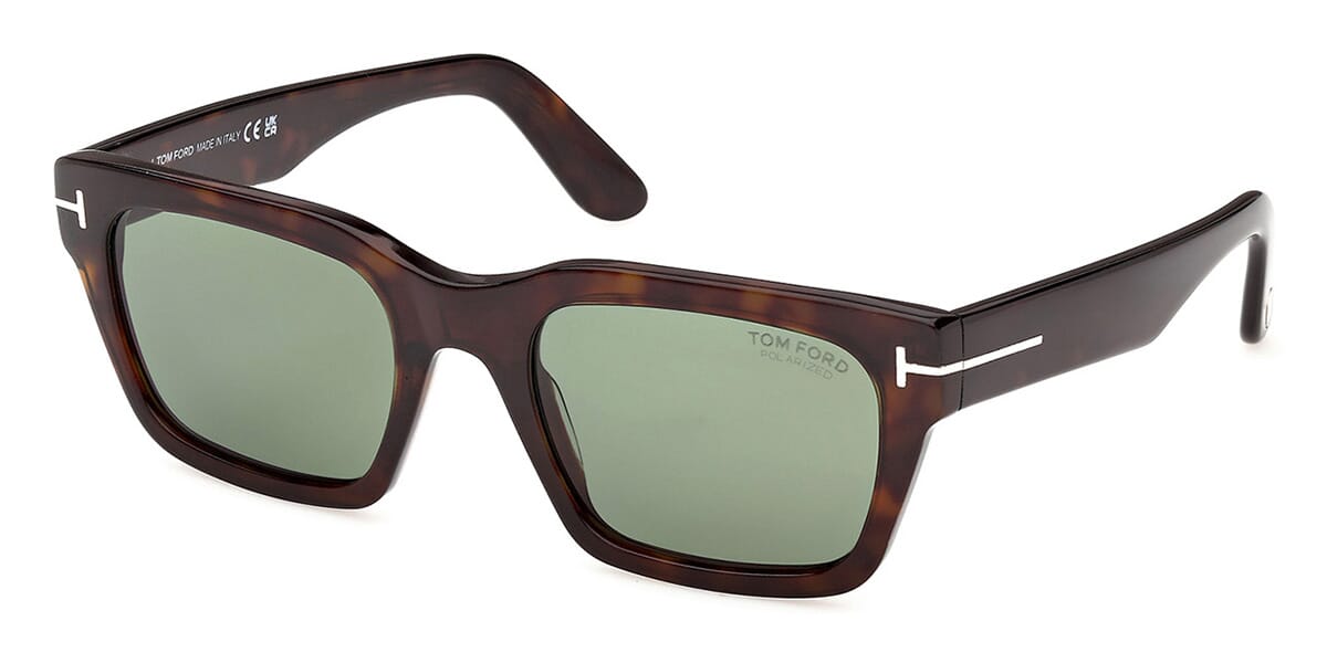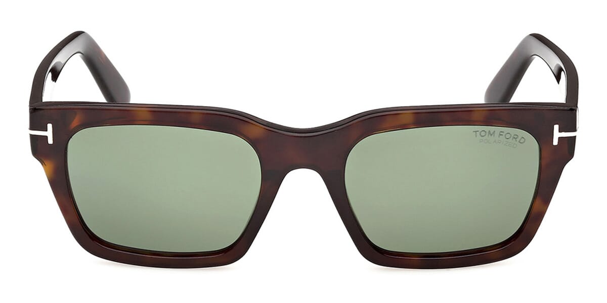 This square Tom Ford sunglass comes in a dark havana frame with green polarised lenses.