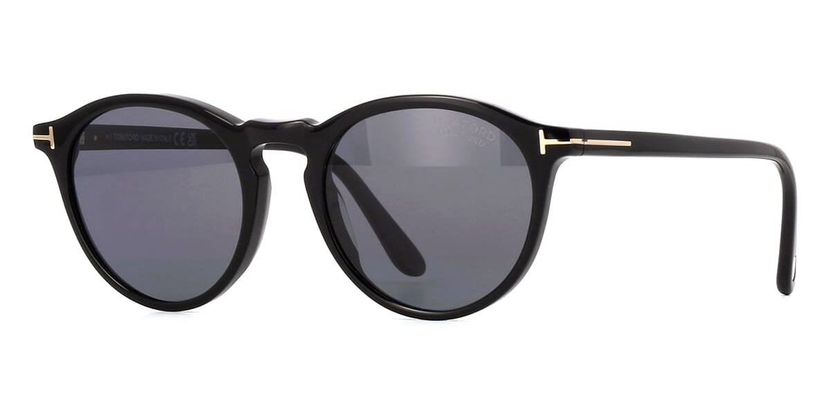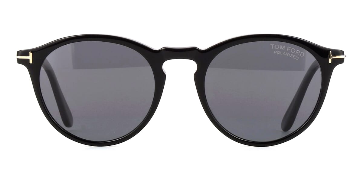 This round Tom Ford sunglass comes in a shiny black frame with grey with light mirror polarised lenses.