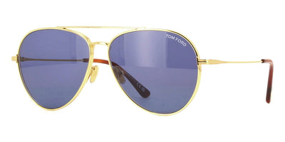 This aviator Tom Ford sunglass comes in a gold with turquoise frame with light blue lenses.