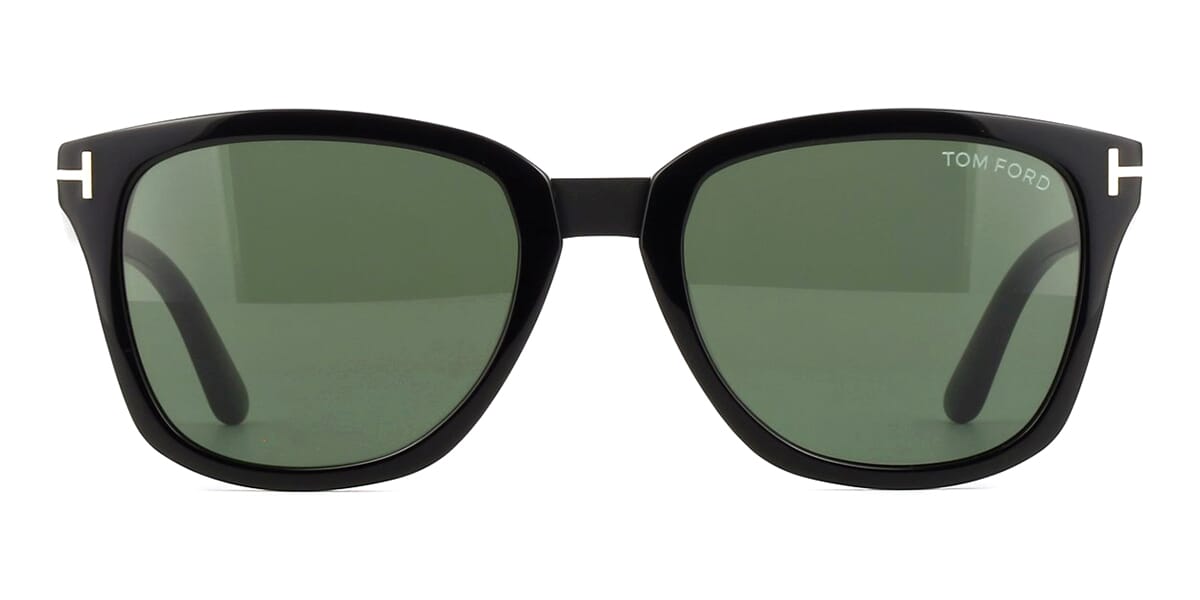 This square Tom Ford sunglass comes in a shiny black frame with green with light mirror lenses.