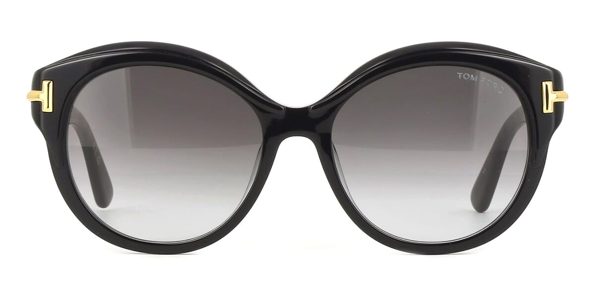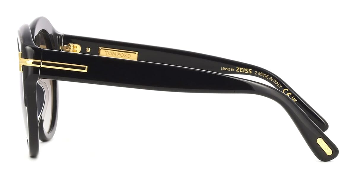 This round Tom Ford sunglass comes in a shiny black and gold frame with grey gradient with light mirror lenses.