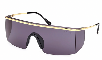 This shield Tom Ford sunglass comes in a shiny gold with black frame with light grey with light silver mirror lenses.