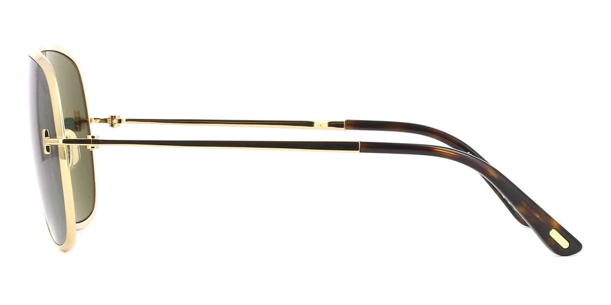This aviator Tom Ford sunglass comes in a shiny gold frame with dark green lenses.