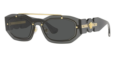 This rectangular Versace sunglass comes in a crystal grey with silver mirror frame with light grey with silver mirror lenses.