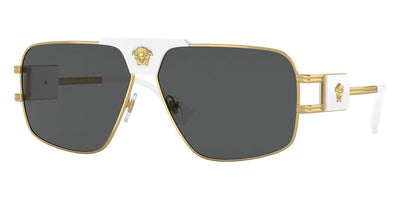 This square Versace sunglass comes in a gold frame with dark grey lenses.