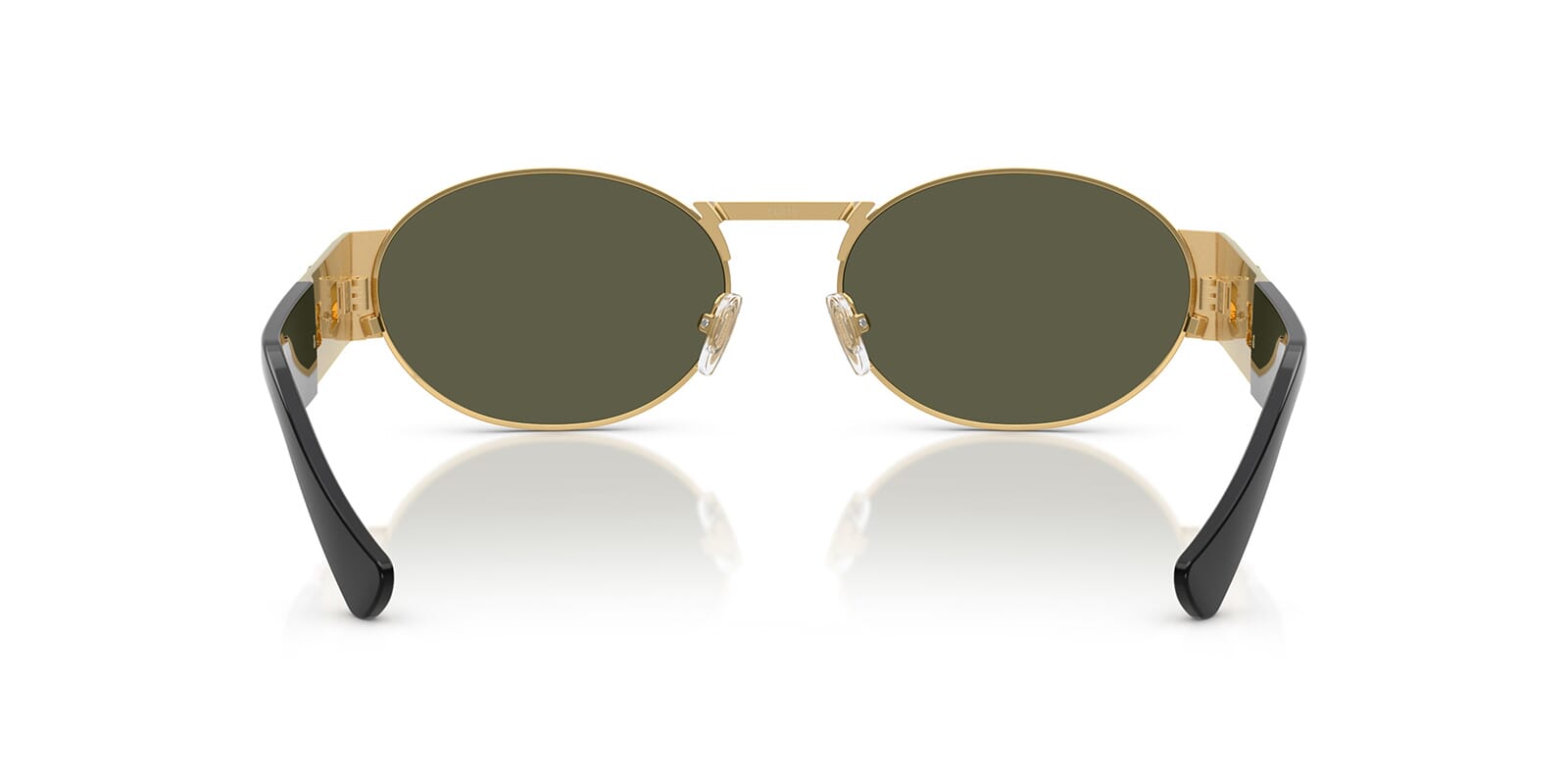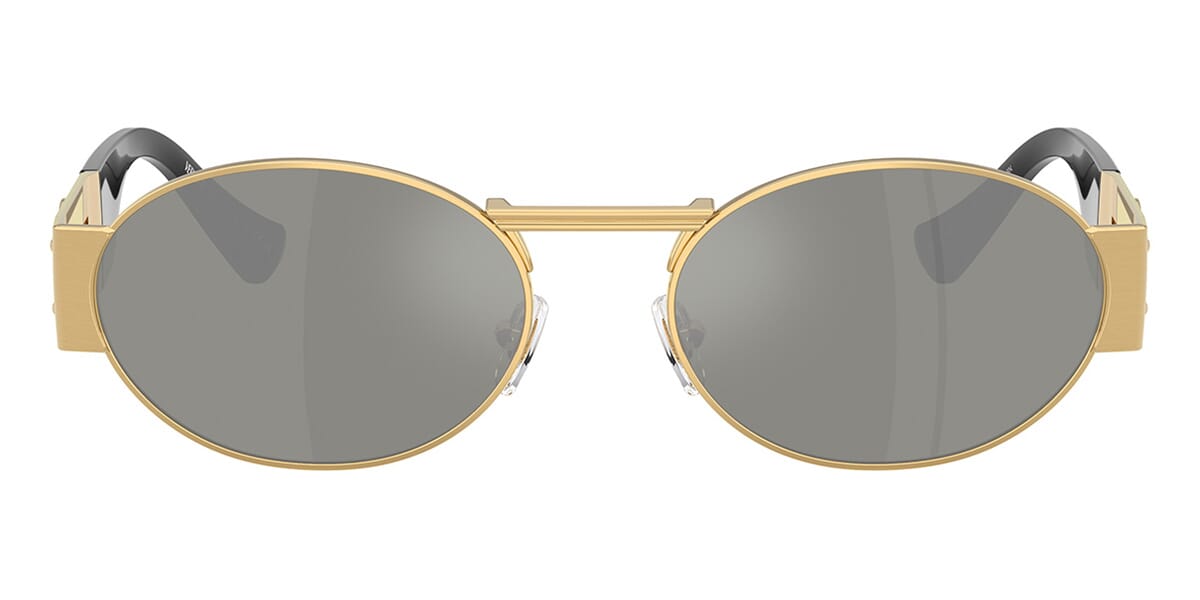This round Versace sunglass comes in a gold frame with green with silver mirror lenses.