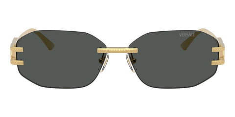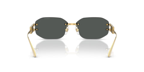 This rectangular Versace sunglass comes in a gold frame with dark grey lenses.