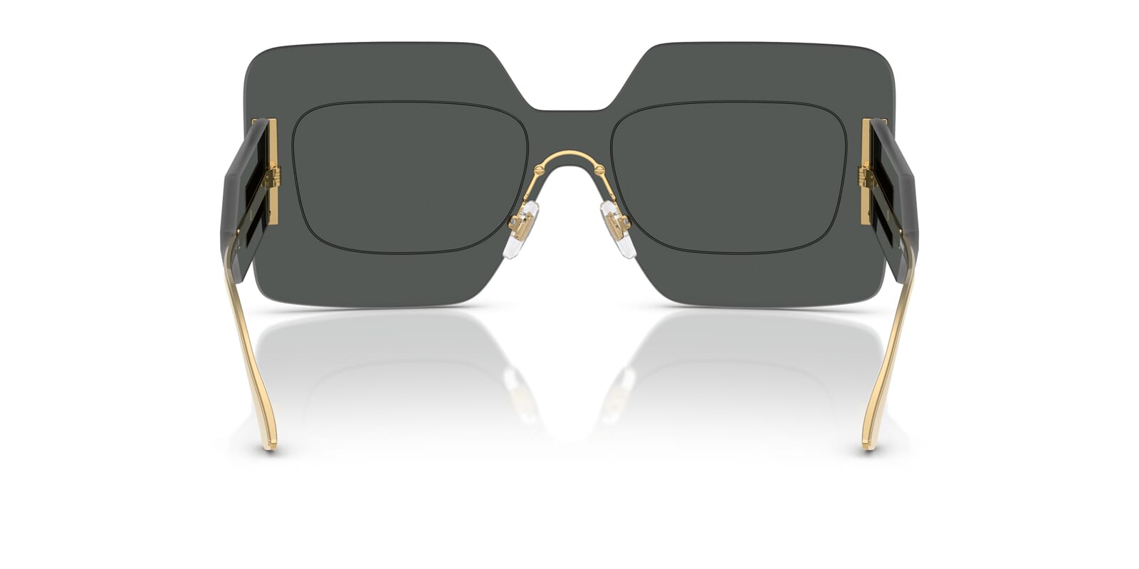 This shield Versace sunglass comes in a dark grey frame with dark grey lenses.