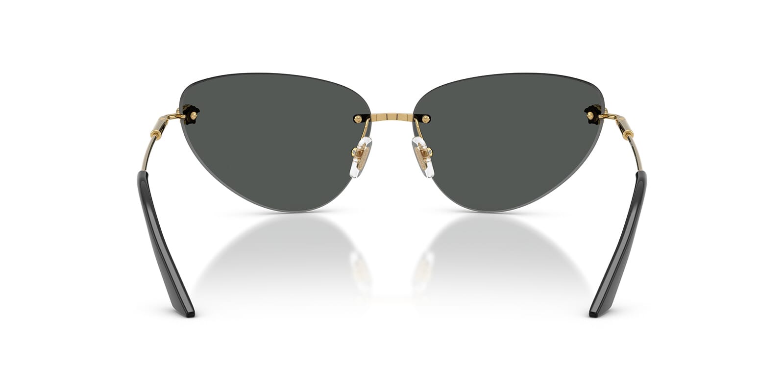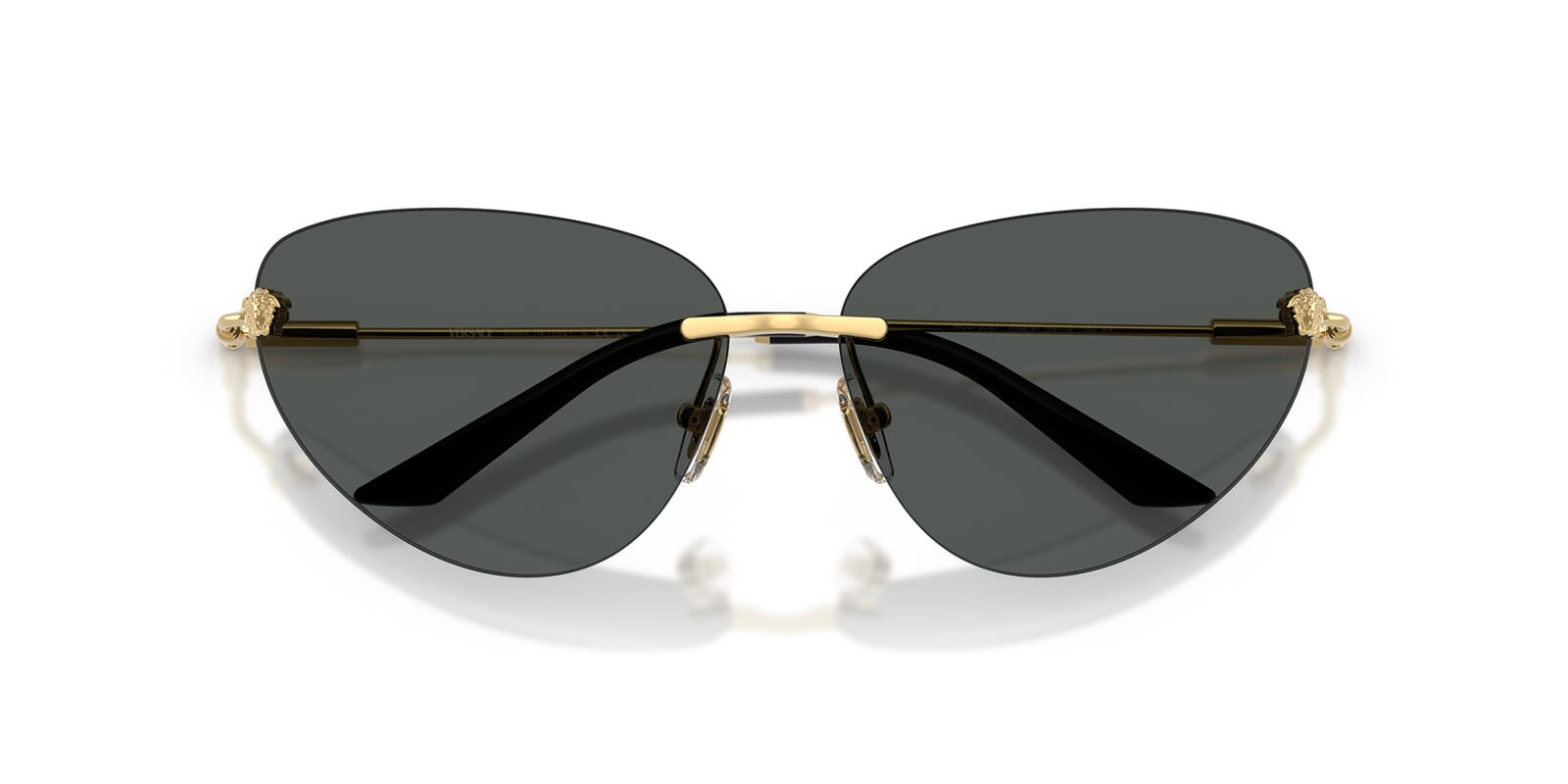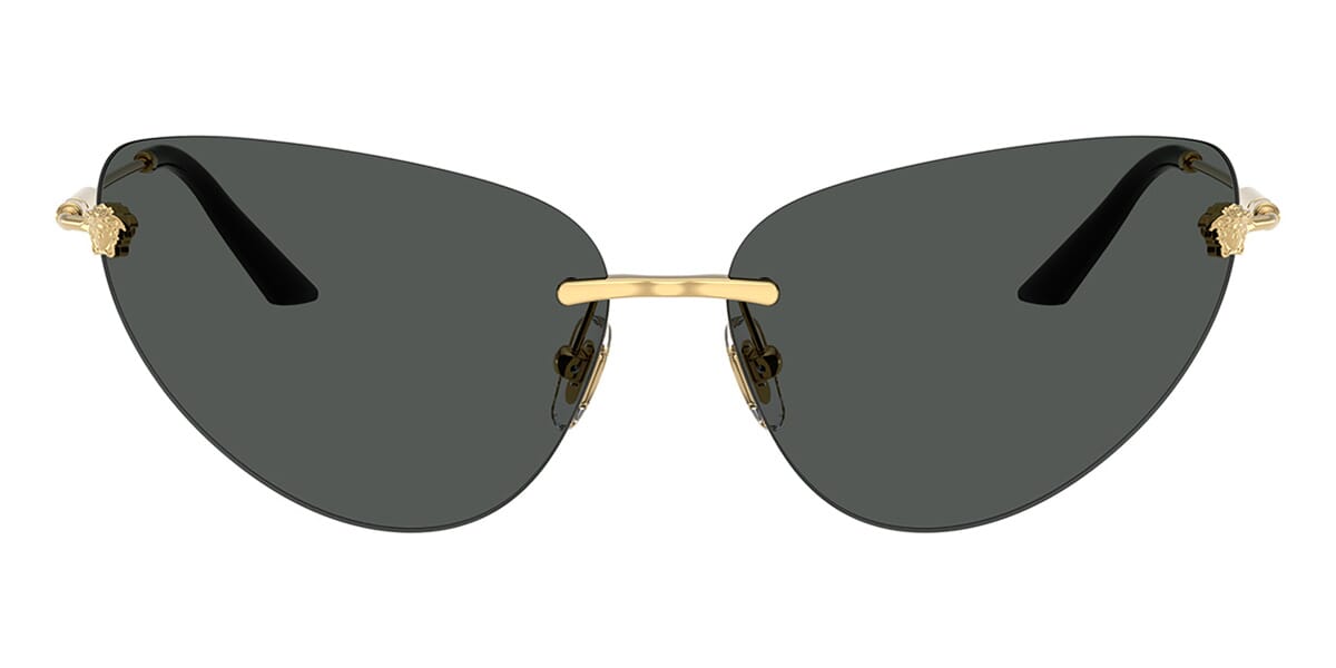 This cat eye Versace sunglass comes in a gold frame with dark grey lenses.