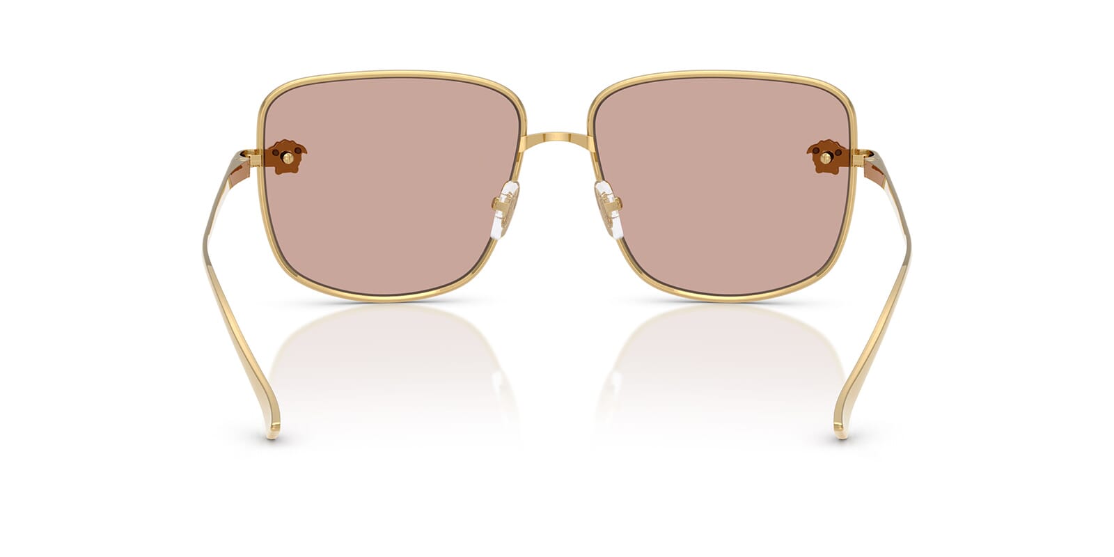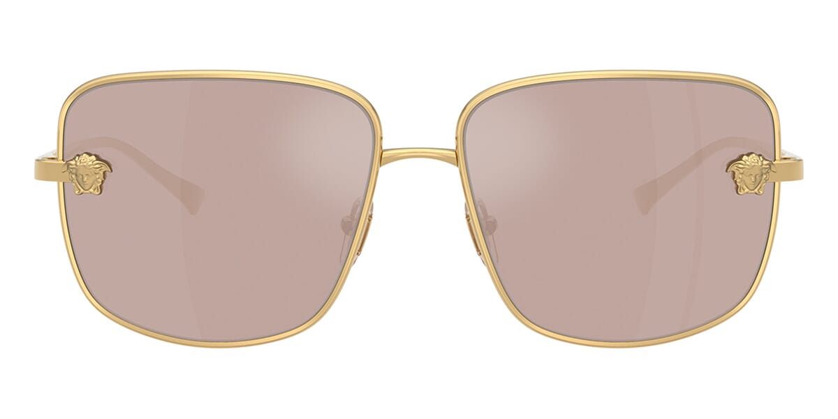 This square Versace sunglass comes in a gold frame with light pink with silver mirror lenses.