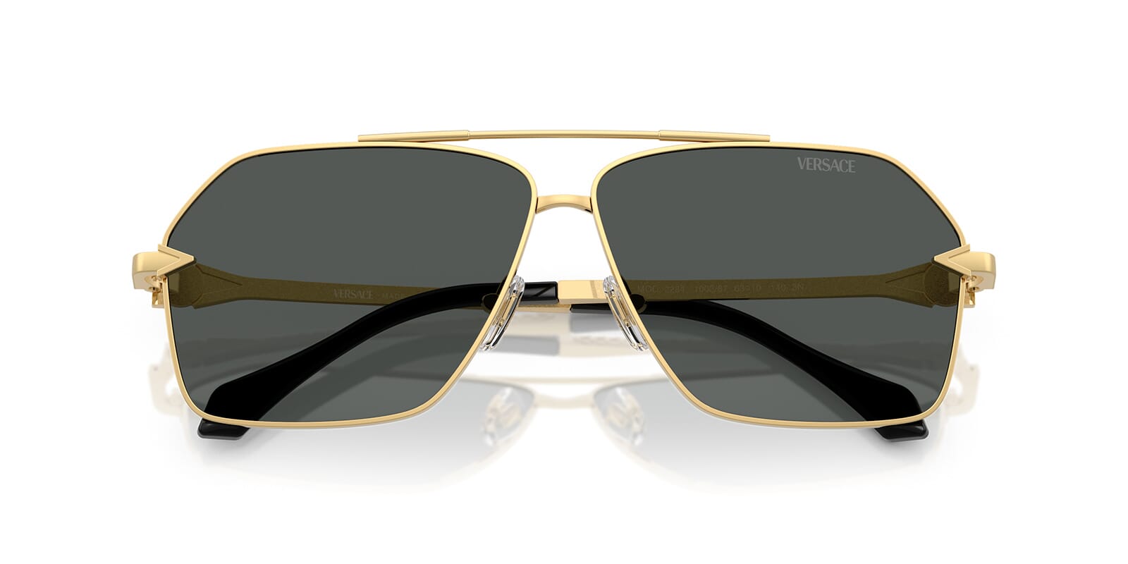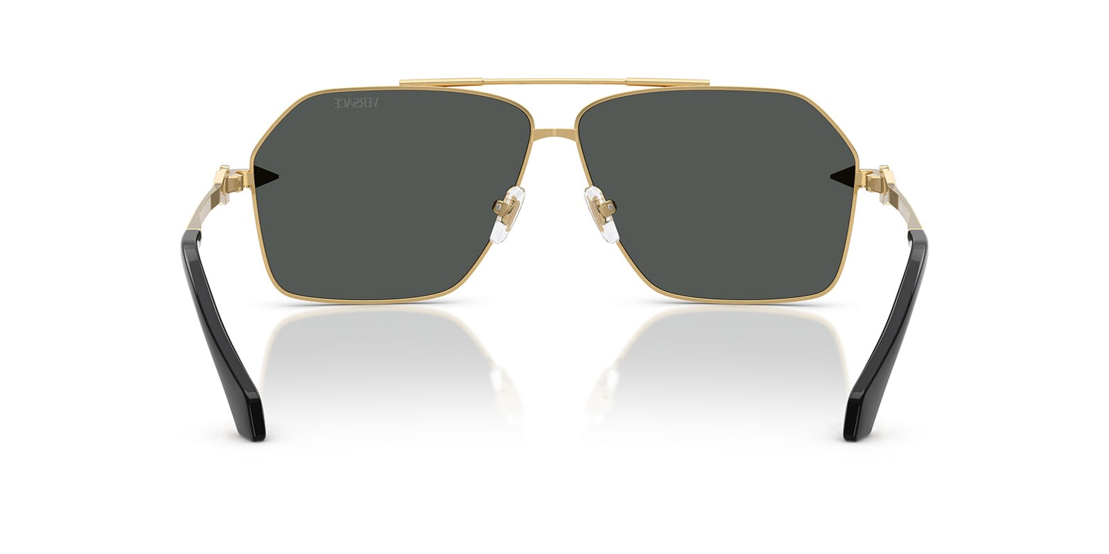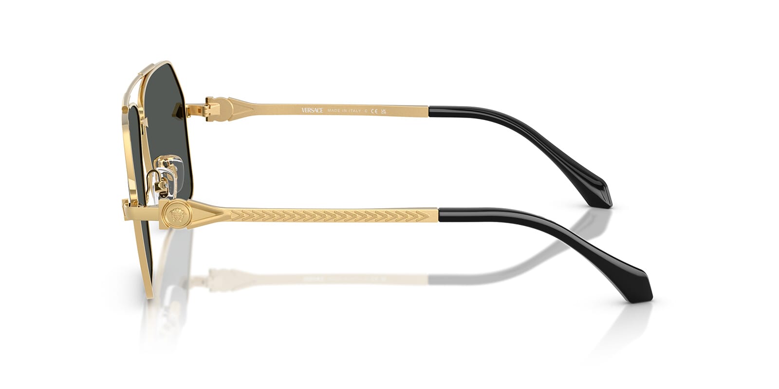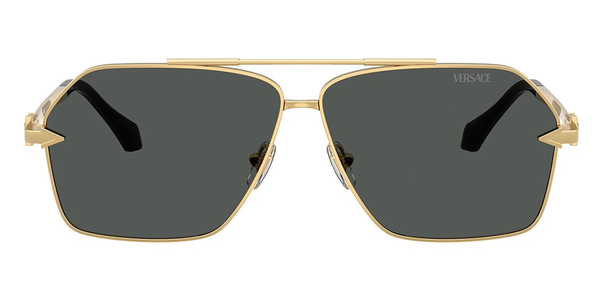 This aviator Versace sunglass comes in a gold frame with dark grey lenses.