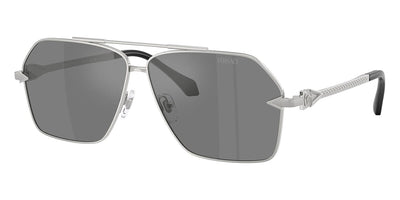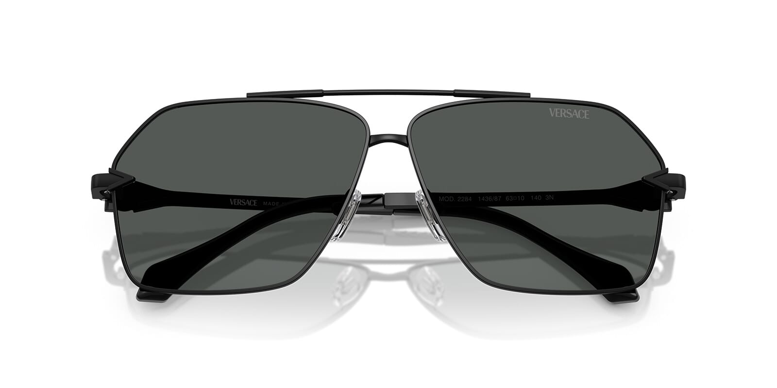 This aviator Versace sunglass comes in a matte black frame with dark grey lenses.