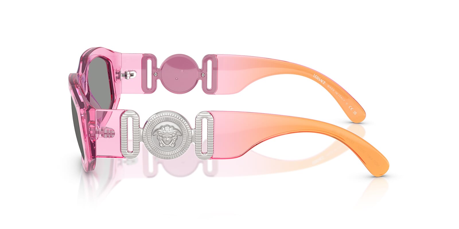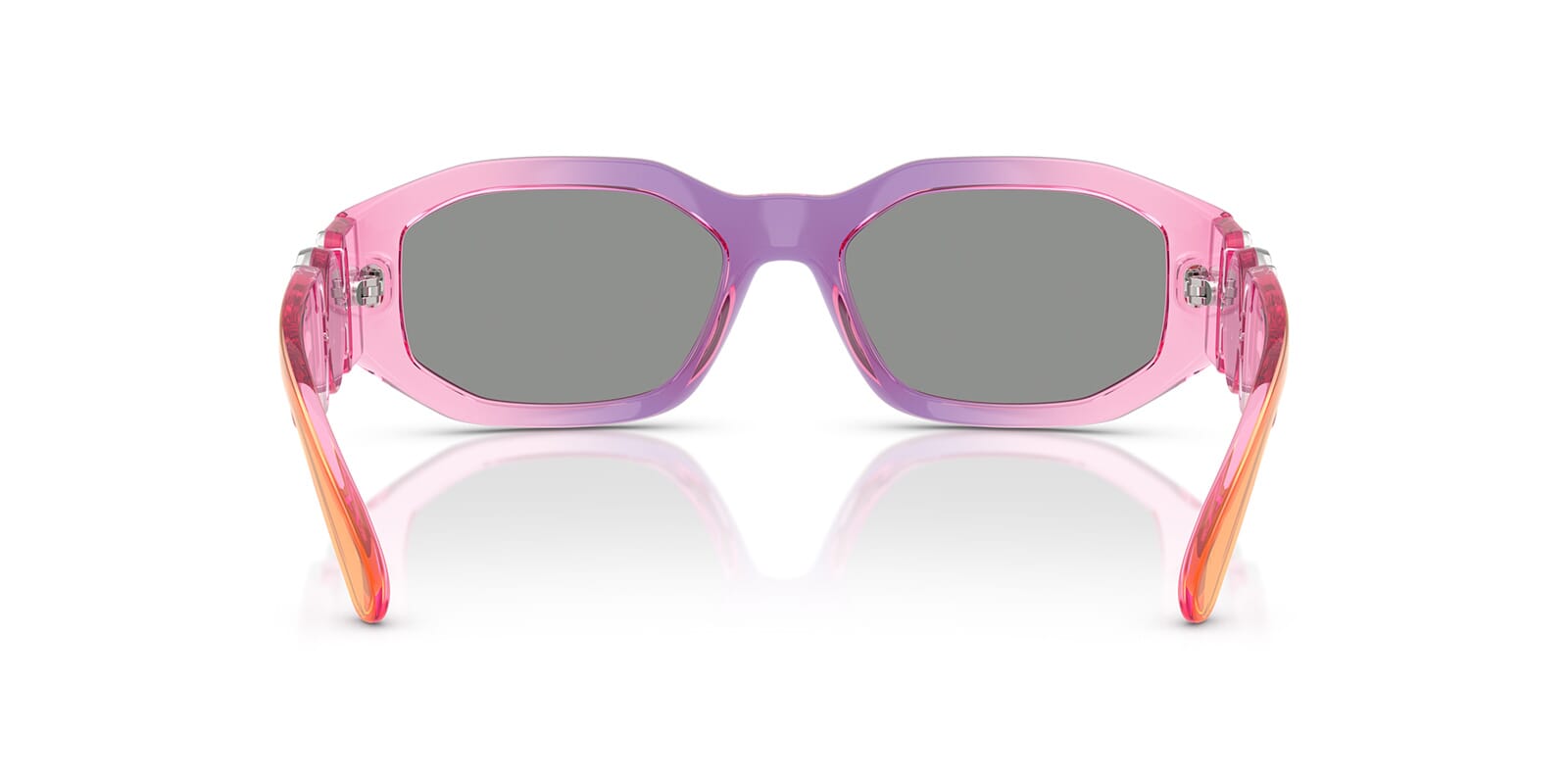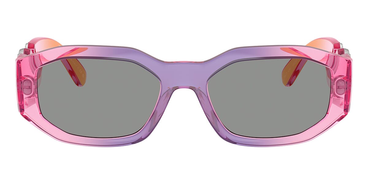 This rectangular Versace sunglass comes in a pink gradient with violet and orange frame with grey lenses.