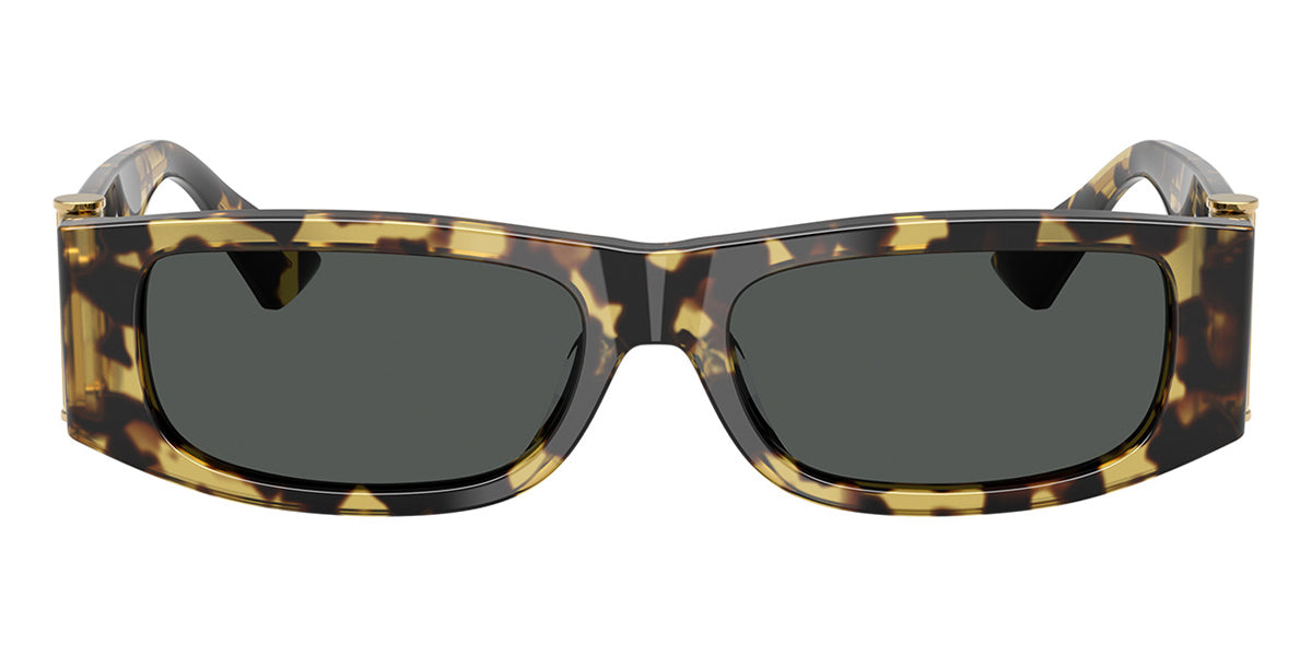 This rectangular Versace sunglass comes in a havana frame with dark grey lenses.