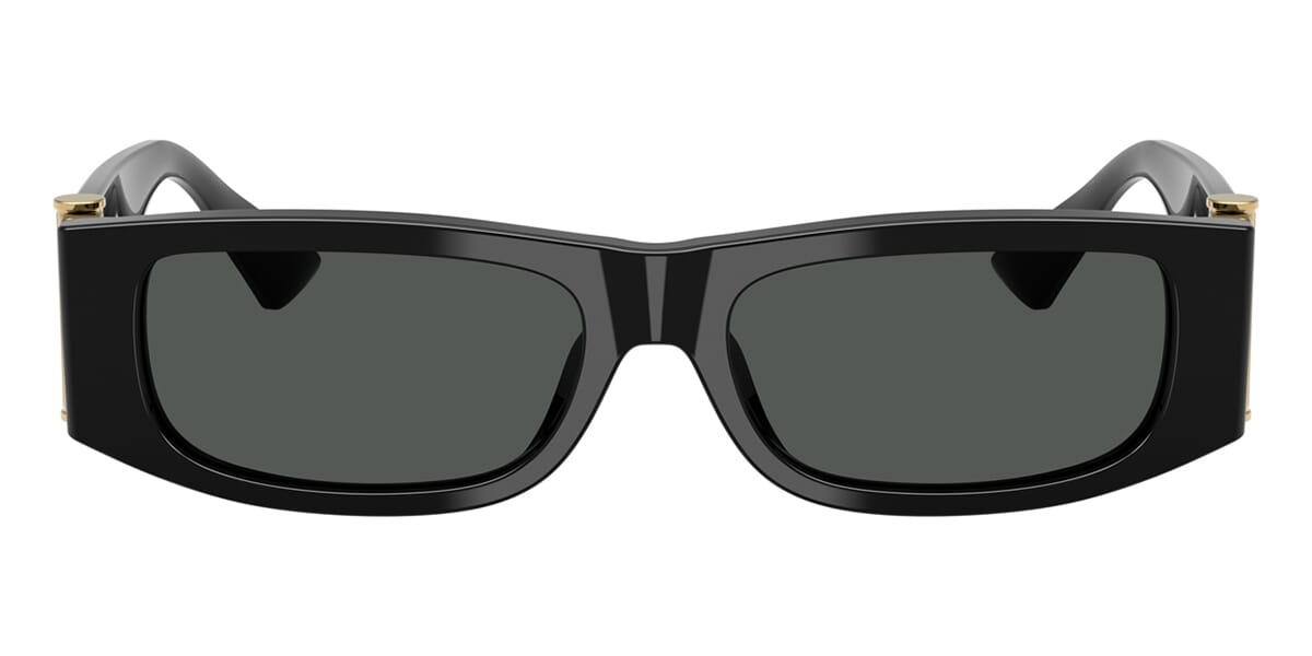 This rectangular Versace sunglass comes in a black frame with dark grey lenses.