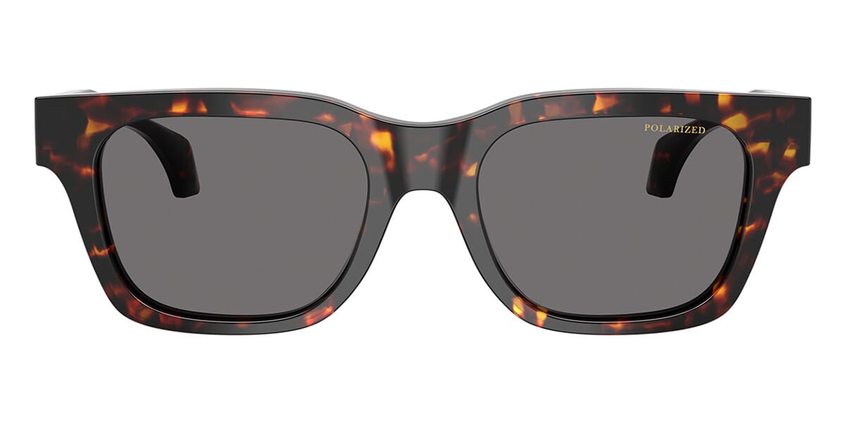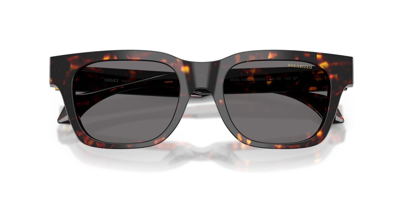 This square Versace sunglass comes in a havana frame with dark grey polarised lenses.