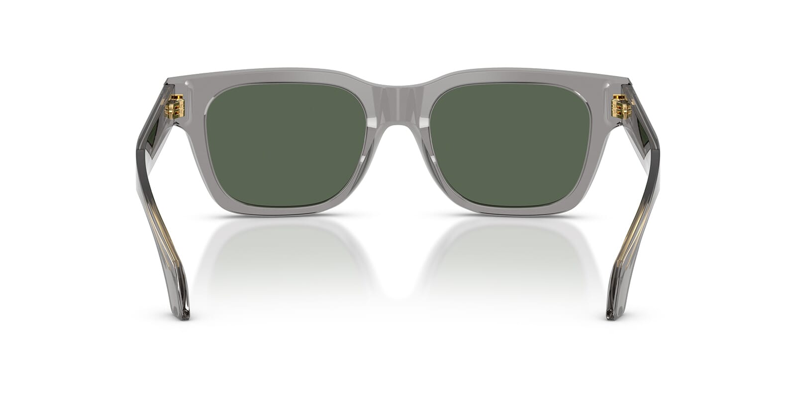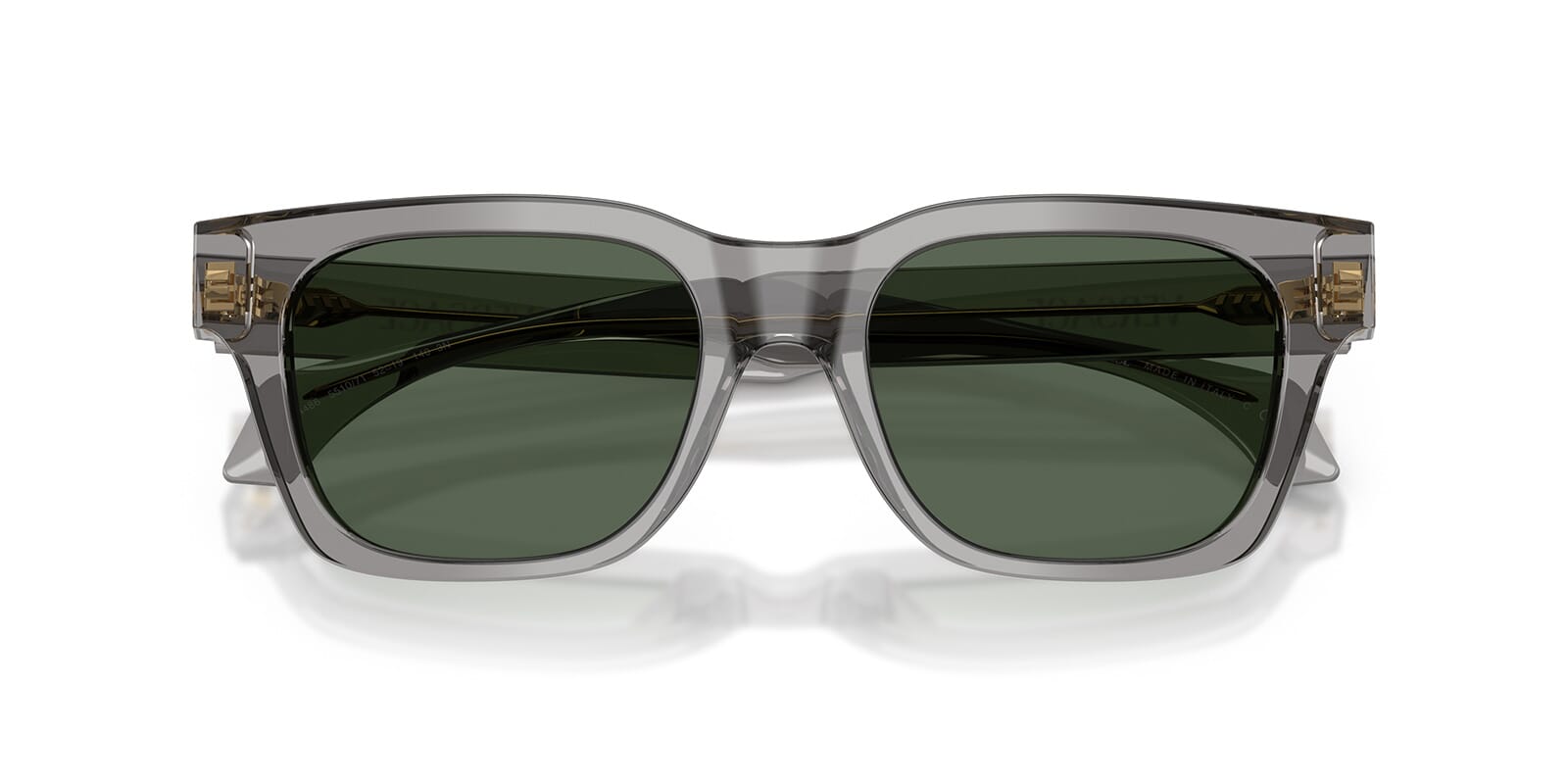 This square Versace sunglass comes in a grey crystal frame with dark green lenses.