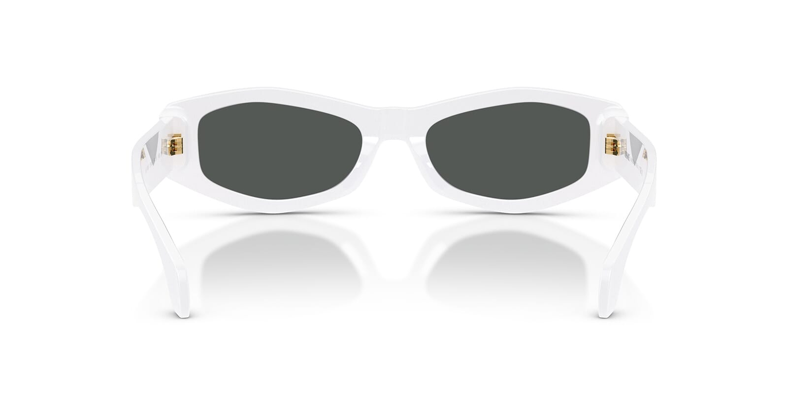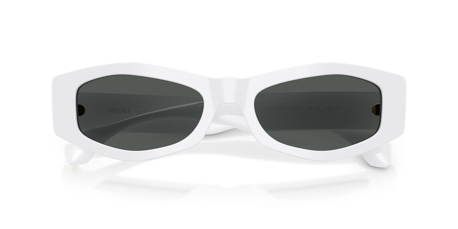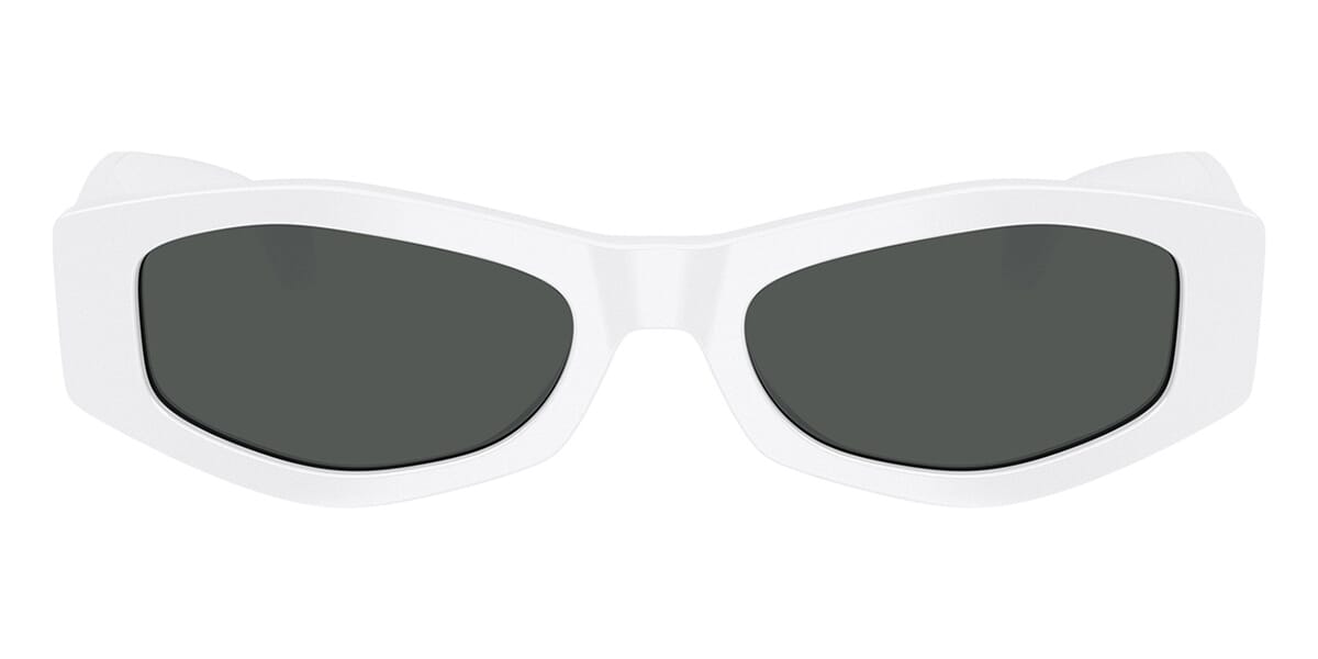 This rectangular Versace sunglass comes in a white frame with dark grey lenses.