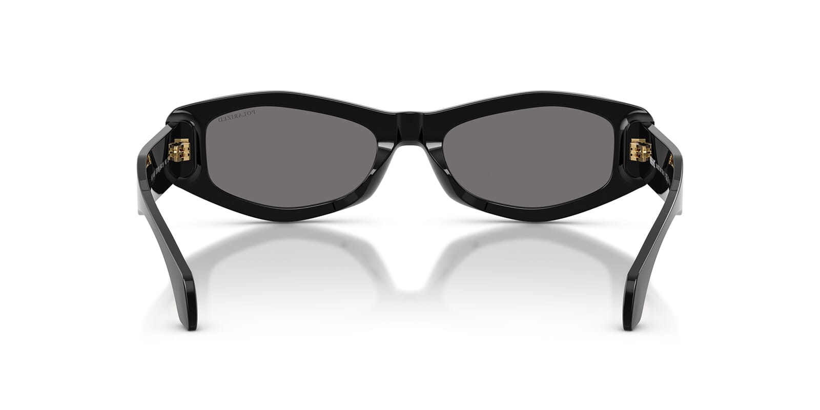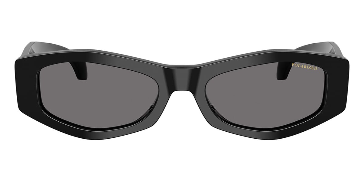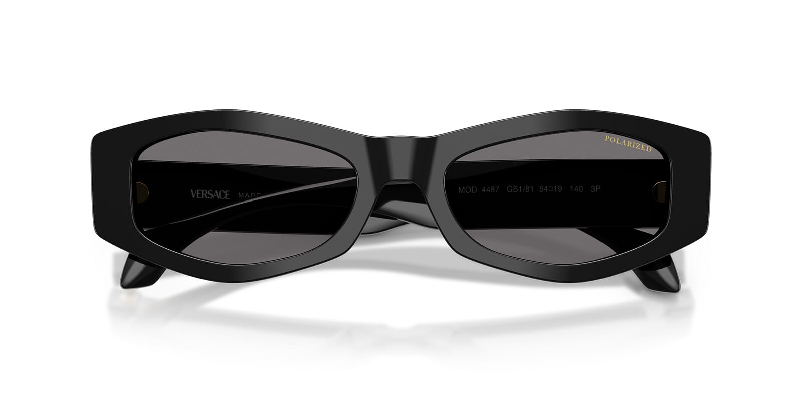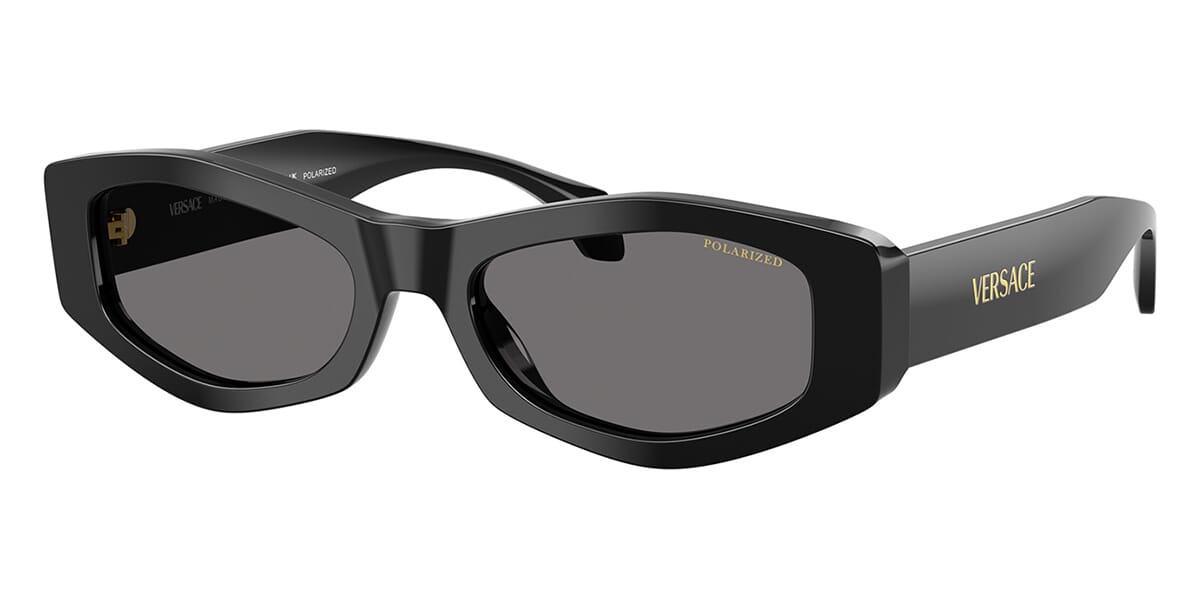 This rectangular Versace sunglass comes in a black frame with dark grey polarised lenses.