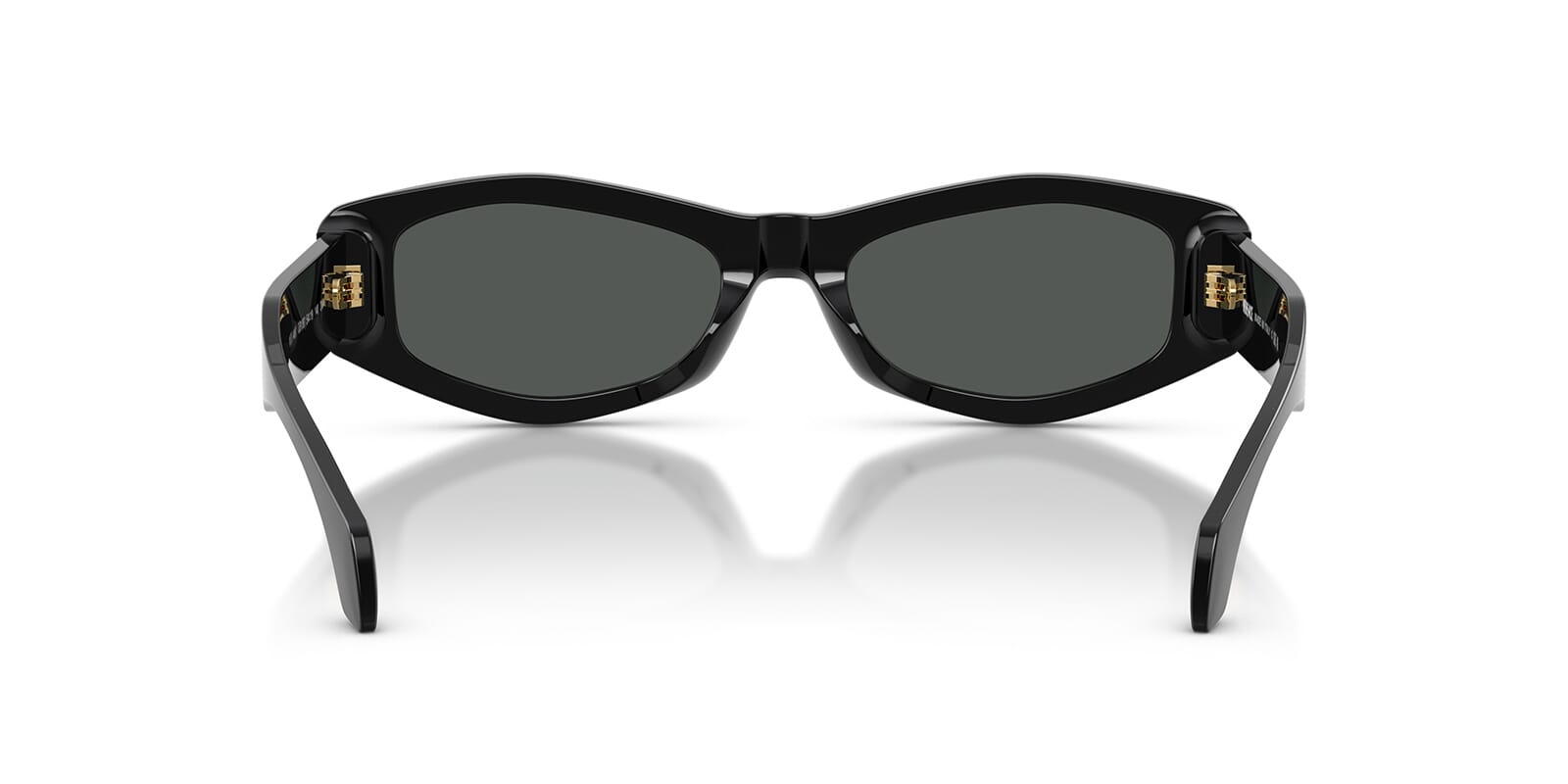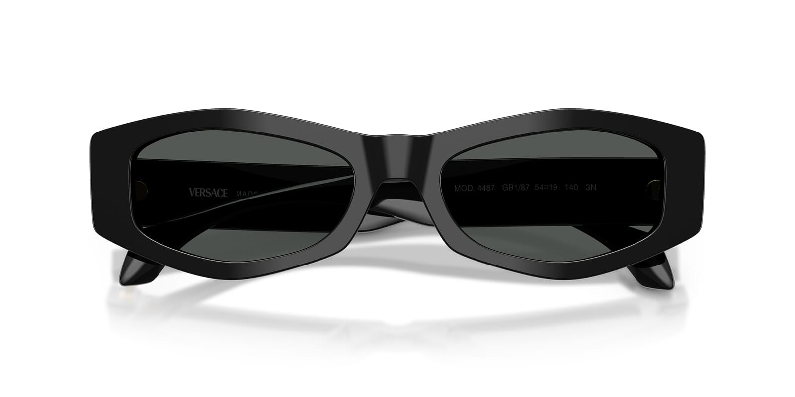 This rectangular Versace sunglass comes in a black frame with dark grey lenses.