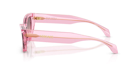 This cat eye Versace sunglass comes in a transparent rose frame with rose grey gradient lenses.