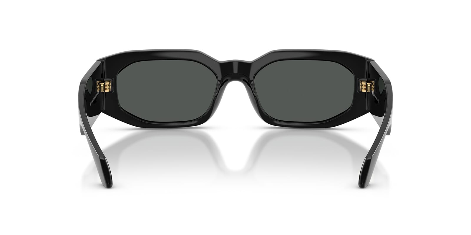 This rectangular Versace sunglass comes in a black frame with dark grey lenses.