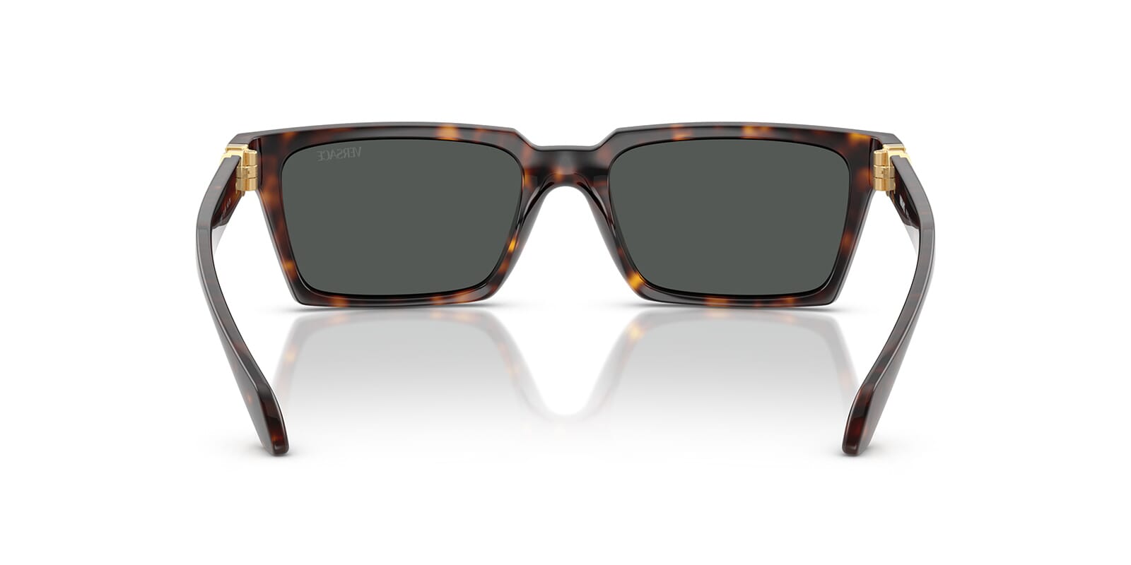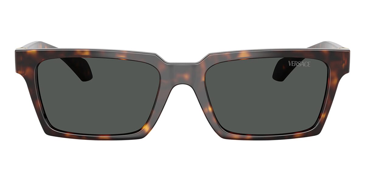 This rectangular Versace sunglass comes in a havana frame with dark grey lenses.