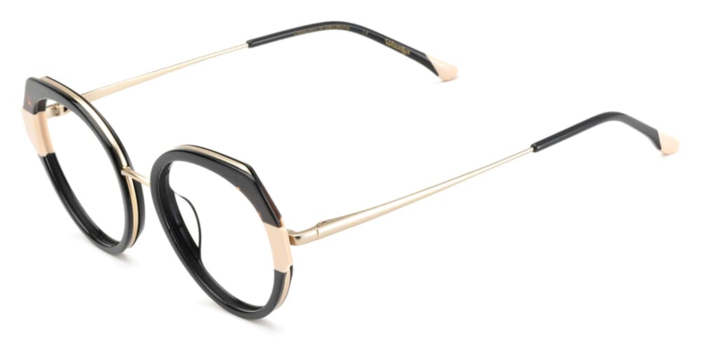 This square Woodys optical comes in a dark brown tortoise with gold frame.