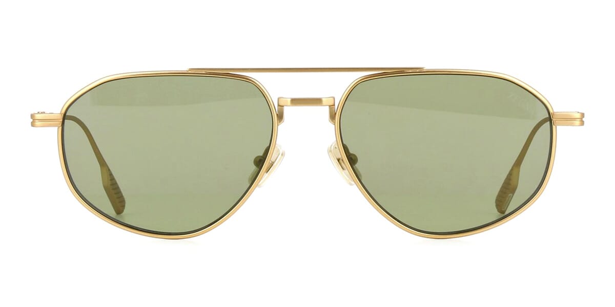 This aviator Zegna sunglass comes in a satin gold frame with light green lenses.