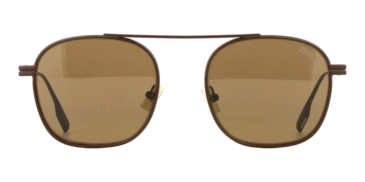 This square Zegna sunglass comes in a matte brown frame with brown with light mirror lenses.