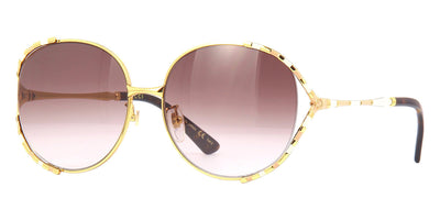 This round Gucci sunglass comes in a gold and ivory frame with brown gradient lenses.